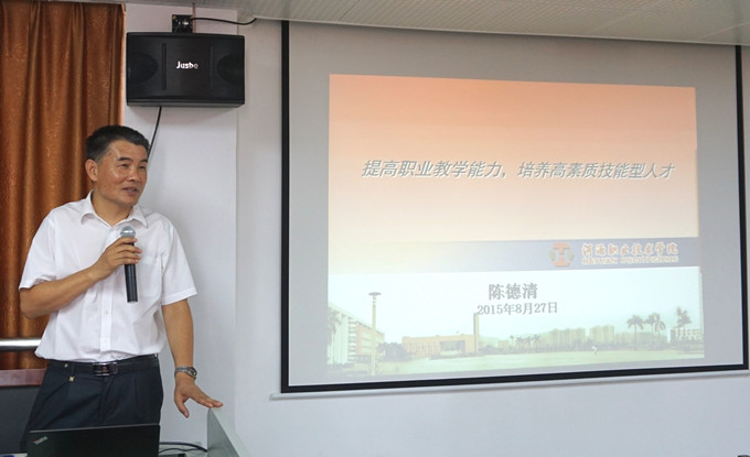 陈德清副校长随后也给新进教师上了精彩生动的一课。他在“提高职业教学能力,培养高素质技能型人才”的主题讲座中,给新老师介绍了职教改革的最新动向、南洋理工学院的成功办学经验以及我校的教学实践改革,并鼓励新老师要努力提高自身素养。