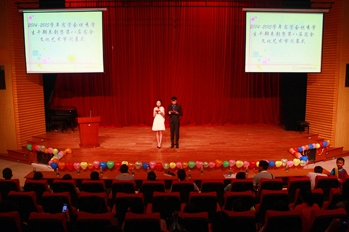 为树立典型,表彰先进,钟丹老师首先宣读10名优秀学生干部及第八届宿舍文化艺术节的表彰名单。学生工作处相关负责人对在本次宿舍文化节中参与铁甲战车、环保设计与自行车慢骑等比赛项目中表现突出的选手给予鼓励,对比赛中表现出来的团结合作、奋勇争先的竞赛精神给予表彰。学生工作处相关负责人表示,宿管会保障了宿舍的良好秩序和学生的切身利益,营造了和谐稳定的住宿环境,其严于律己、以身示范的服务精神值得广大师生借鉴。