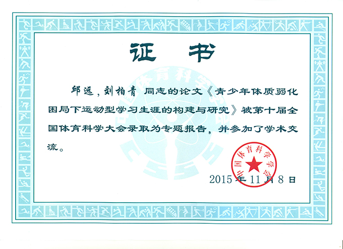 第十届全国体育科学大会收录证书