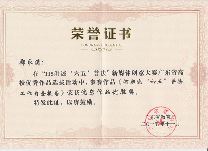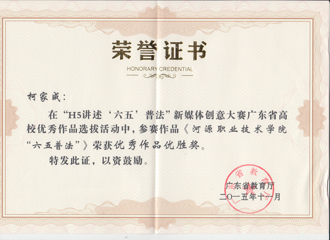 活动共收到来自全省25所高校报送的作品165件,经评审,共评选出优秀作品64件,其中一等奖3件,二等奖5件,三等奖10件,优胜奖46件;该我校电信学院组织报送了3件作品,均获得优胜奖,分别是:《河职院“六五”普法工作自查报告》(计算机多媒体技术专业:郑永涛)、《易游app入口站官网“六五普法”》(计算机多媒体技术专业:柯家成)、《河职院六五普法教育》(软件技术专业:董遥胜)。
