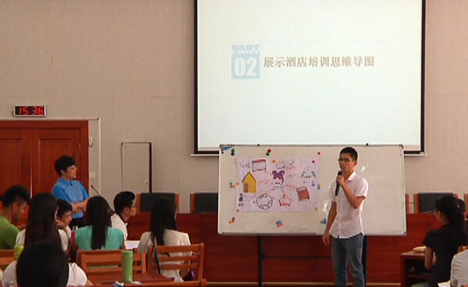 曾惠华老师在教学中注入 “翻转课堂”理念,巧妙选择和运用了企业培训的教学手段,给在场的老师和学生们上了精彩的一课。曾老师启发学生在绘制“酒店培训思维导图”的过程中整理知识点,利用导图有效解决“挖掘选择培训主题”、“设计培训内容和方法”“预测评估课题效果”等问题。“课程心电图(教学方法设计)” “思考帽(培训者思维动态管理)”等新鲜词让前来旁听的教师耳目一新,曾老师强调培训设计宜从大处着眼,小处着手,培养学生主动学习热情。学生团队在课下谋划布局、动手操作,在课上积极发言、存疑解惑,自我取名为“嘻哈队”、“狼窝队”、“生产队”等,表现出积极向上、高度活跃的学习风貌。