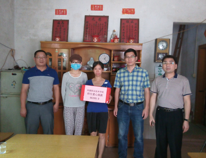 6月3日,校团委负责人、电信学院学生工作负责人及师生代表前往江门市探望、慰问伍颖雯同学,并为她送上我校目前筹集的6万多元的爱心善款。
