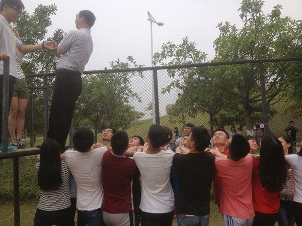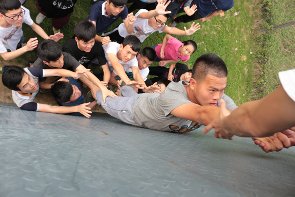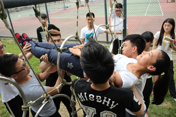 在学校素质拓展训练基地,各大学生组织、各二级学院学生干部共同完成了“背摔”、“雷阵”、“过电网”、“坐地起身”、“翻越求生墙”五个地面拓展训练项目。在“背摔”项目中,队员们相互信任,克服恐惧,姿势优美地完成了规定动作。在“雷阵”项目中,各队员齐心协力,相互配合,有惊无险地到达了目标终点。在“过电网”项目中,队员们冷静应对,周密部署,有条不紊地完成了艰难任务。在“坐地起身”项目中,队员们相互协调,均衡发力,手不触地地完成了起身动作。最后,在4米高的“求生墙”前,队员们抱着坚定必胜的信念,充分发挥了团队精神,利用集体的力量顺利完成了翻越。在整个拓展训练中,每位队员都以阳光的心态积极参与,用实际行动诠释了团结合作、信任沟通、超越自我的团队精神。