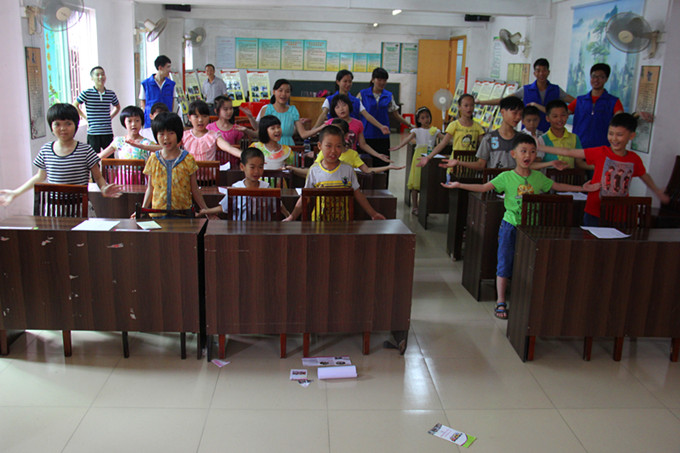 简短的启动仪式后,志愿者们进行了开营的第一堂授课,课程内容包括音乐教学,歌曲合唱,营员表演与蹲萝卜游戏等环节,学员们都积极投入,乐在其中。志愿者在课时结束后对以后的课程和注意事项进行了讲解。