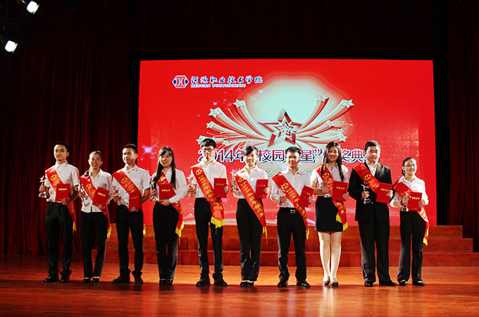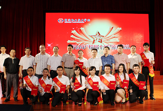 6月24,我校在艺术楼演播厅举行2014年“校园十星”颁奖典礼。党委书记高仁泽、副书记韦荣、副校长唐汉芳、陈农心、赖小景和各二级学院相关负责人及学生代表出席了本次颁奖典礼。