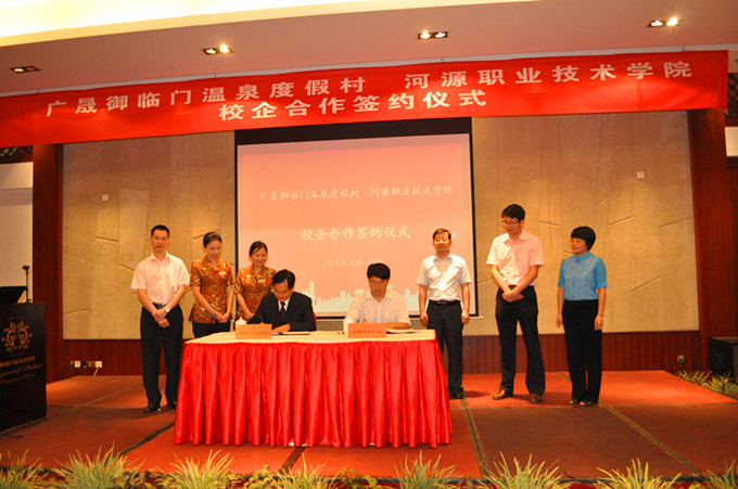 6月8日,我校校长刘安华率工商管理学院酒店管理专业的全体老师,联同酒店管理专业指导委员会全体成员共计26人前往紫金御临门温泉度假村,与该公司总经理陆东明签约御临门温泉订单班、河职院科技服务双方协议,共同探讨更深层次的校企合作。