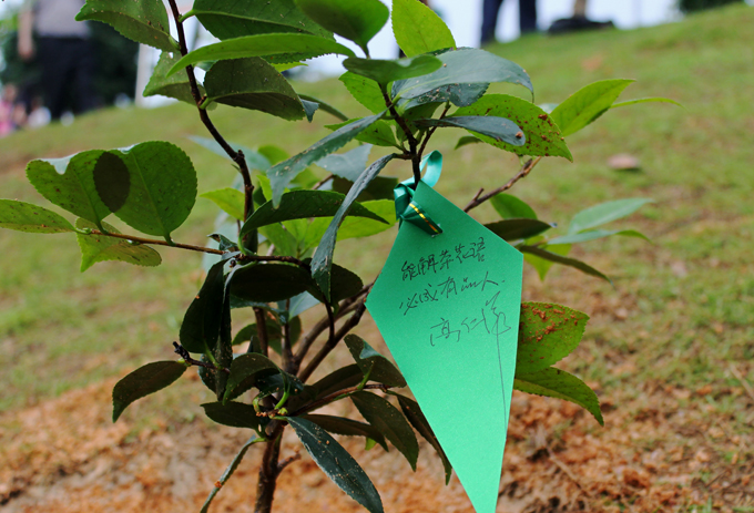 溜冰场旁的小山坡上,高仁泽、唐汉芳和学生代表一起共同为“星星林”揭牌,并带领人文十星、五星班级代表分小组进行植树活动。记者看到,现场气氛活跃,大家都积极认真地忙活起来。在雨水的洗涤下,新种的树木散发着碧绿的光芒,枝头上悬挂着领导老师、同学们为所种植的树木书写的祝福语。