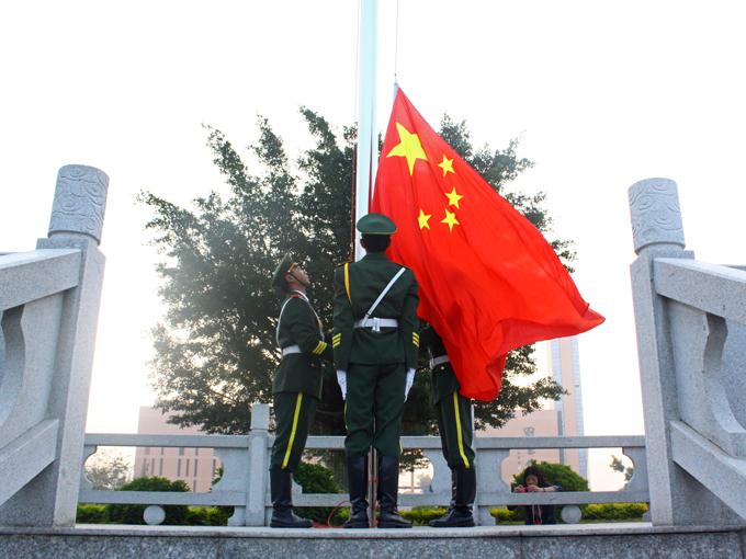 在国旗护卫队整齐、庄严地出旗之后,五星红旗伴随着雄壮的国歌声冉冉升起。国旗护卫队代表甘芳媚以“追忆过去,勿忘历史”为主题发表讲话,她简叙了1935年的北平学生抗日示威游行事件,并表示当代大学生应把爱国精神转化为爱学校、爱班级、爱学习的热情,努力为校、班级争光。
