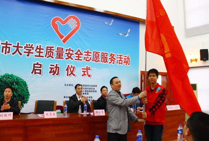 活动由市质监局、团市委、市出入境检验检疫局、市教育局等单位主办,由我校和市志愿者联合会联合承办。学校副校长赖小景、市质监局副局长陈宇平、团市委副书记张志勇、市教育局副局长黄伟、市出入境检验检疫局纪检组长赖强辉等出席启动仪式。赖小景代表学校致辞,张志勇为服务队授旗,陈宇平对新成立的质量安全志愿服务队提了要求与希望。 据悉,市大学生质量安全志愿者活动是我校配合“市质量安全风险隐患排查整治”和“道德领域突出问题专项教育治理活动”所开展的志愿服务活动。学校团委在全校范围招募了60名优秀大学生加入市大学生质量安全志愿服务队,他们将通过质量安全志愿服务,激发公民关注质量安全,增强全民质量意识,加强质量诚信建设,推动社会管理创新。 据悉,我校将在今年的国际志愿者日前后开展一系列志愿服务活动。其中,青年志愿者协会将开展“给校园树木涂抹防寒石灰”、“给校园彰贤石文字添描新油漆”等“爱我校园”特色志愿活动,还将继续开展福利院慰问、无偿献血、文化广场环保等品牌志愿服务活动;学校国旗班将开展“校园课桌环保”志愿服务活动。