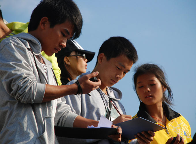 校运会期间,学校共派出600名志愿者维持秩序。他们每天要在开赛前2个小时到达现场搬运桌椅、器材,检查比赛场地,协助检录运动员;比赛时要维持现场秩序,协助裁判,服务运动员,传送、播报成绩;比赛结束后还要收回器材,清理现场,检查是否有人遗失贵重物品。他们分工合作,职责明确,他们活跃在一线,出现在每一个需要他们的角落。