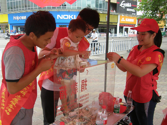 在炎炎烈日下,我校30名志愿者深入老城区周边的街头巷尾分别以翔丰商业广场、街心花园、老城汽车总站等三个募捐点为中心,向四周的街道行人、商铺积极宣传扶贫济困“一元捐”志愿服务活动。广大市民在了解 “一元捐”活动后踊跃捐献,争相为困难群体尽一份微薄之力,据统计,此次活动共募集捐款六千多元。