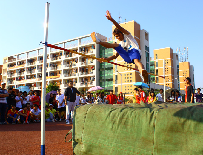 学生男子跳高决赛场上,“电信最牛”、“工商最帅”、“人文最闪”等啦啦队口号此起彼伏,热闹非常。来自电子与信息工程学院的张得海、吴永健和苏淋在19名运动选手中脱颖而出,瓜分三甲。其中,张得海以0.03米的微弱优势荣获冠军,吴永健与苏淋则以相同成绩1.58米位居第二、第三。