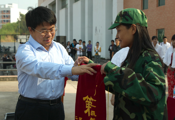 刘安华校长为在军训中表现优异的新生班级授予锦旗