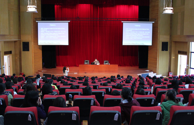 为使我校学子能对美国国家公园文化有进一步的了解,韩霞女士特在我校报告厅为英语专业的同学做了一场主题为《美国国家公园文化》的学术讲座。在简单介绍美国国家公园的历史后,她说到,作为美国最宝贵的历史遗产之一,美国国家公园受到美国人民的爱戴,全世界人能通过它的视窗了解美国的壮丽风貌、自然和历史财富以及国家的荣辱忧欢。