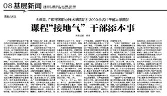 10月10日,国内惟一一份国家级的,面向全国教育界的教育日报,目前中国最具权威和最有影响力的教育新闻媒体《中国教育报》以《课程“接地气” 干部添本事——5年来,广东易游app入口站官网助力2000余名村干部大学圆梦》为题,在第8版基层新闻头条,对我校村干部大专班项目进行了专题报道,认为该项目真正“做到干部的培养与群众需求、村情实际需要无缝对接”。