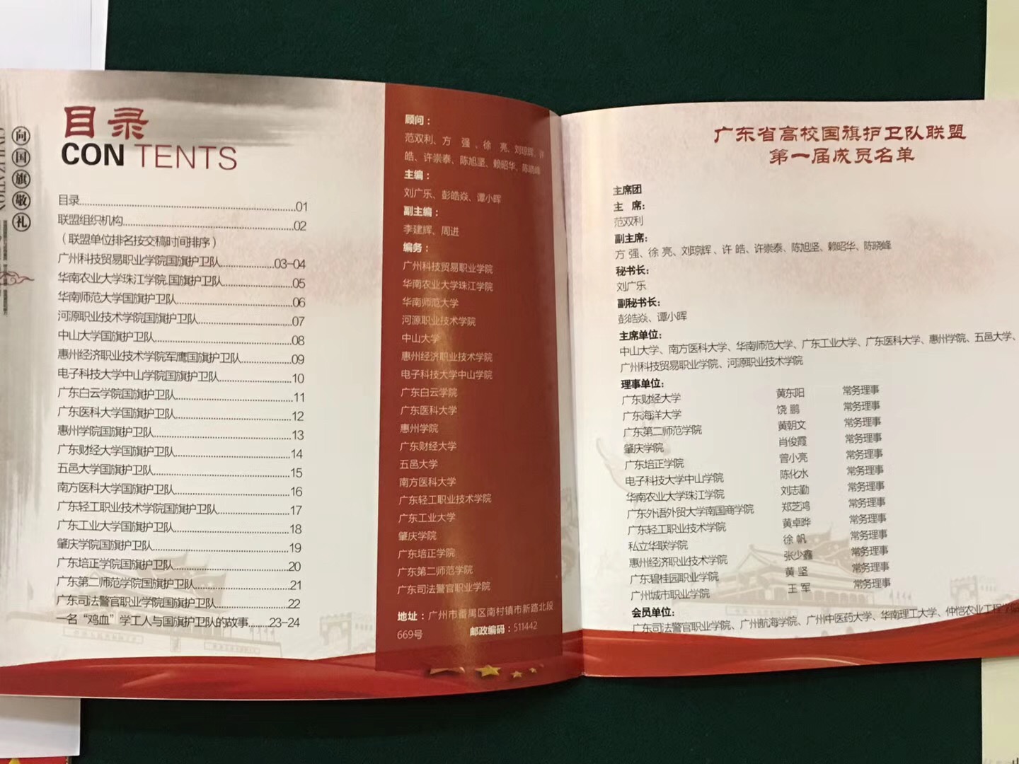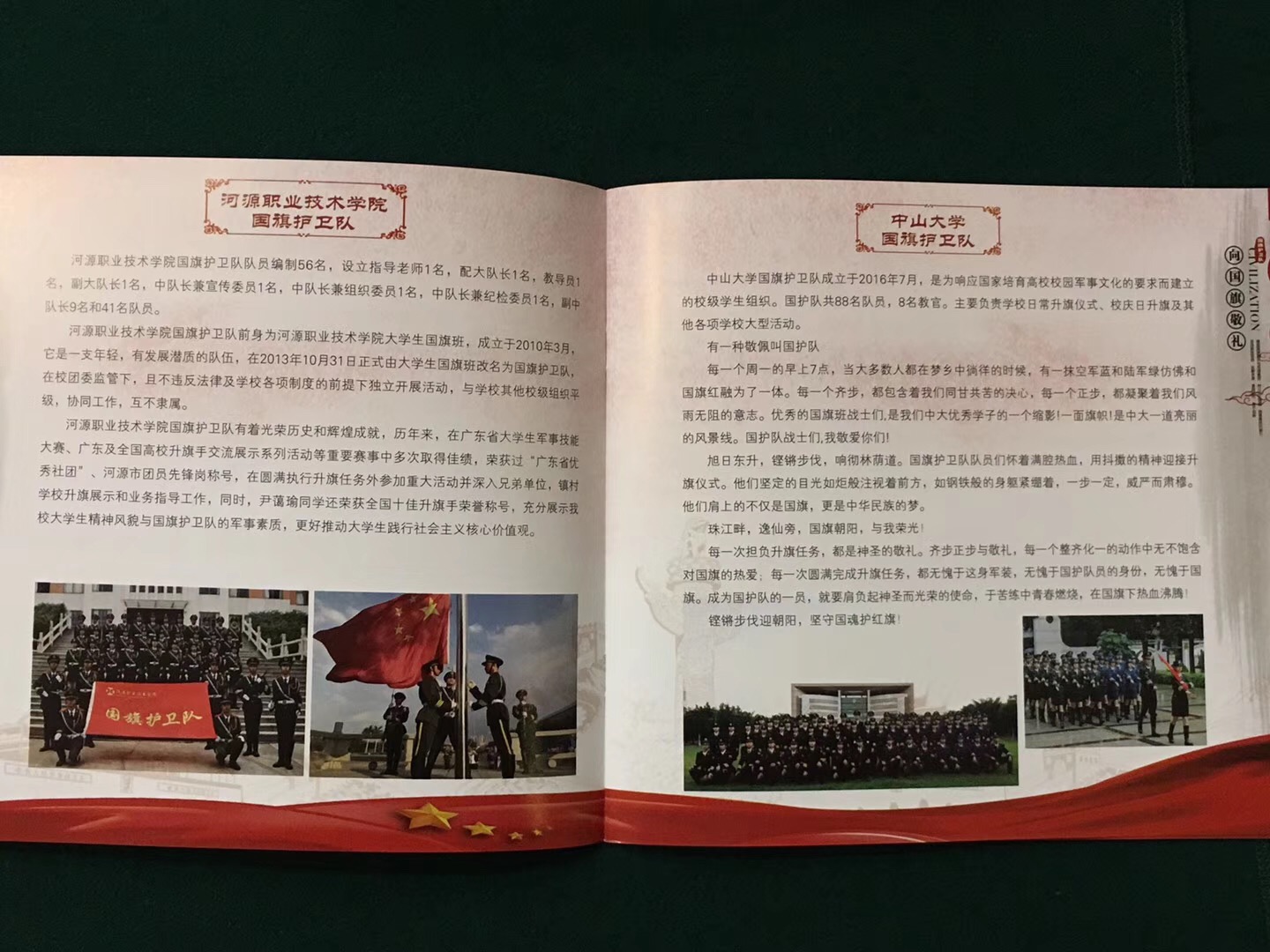 我校荣获“广东省高校国旗护卫队联盟主席单位”、“年度优秀国旗护卫队”称号,我校陈晓峰受任命为“广东省高校国旗护卫队联盟第一届理事会副主席”。黄志远被评为“2017年度广东省高校国旗护卫队优秀指导老师”。