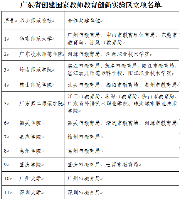 会议公布了11个“广东省创建国家教师教育创新实验区”(下称“实验区”)及合作共建单位名单。华南师范大学、广东技术师范学院等11所本科高校获批“广东省创建国家教师教育创新实验区”立项单位,我校以及其它4所职业院校、21个地级市教育局作为合作共建单位。广东省教育厅党组成员、副厅长王创表示,实验区在设计和建设之初,就被赋予了构建教师教育共同体的重任。为此,广东省财政将预留奖补资金予以支持建设,对教师教育领域单个项目而言,这种支持力度是前所未有的。
