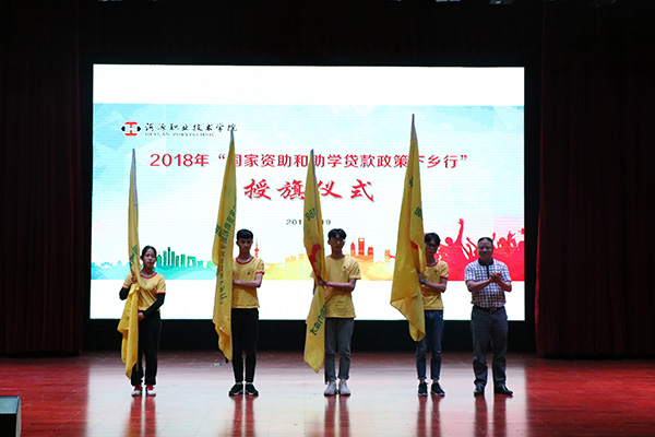 仪式最后,陈农心副校长为青年红色筑梦之旅团队以及大学生党员服务队授旗,何智聪处长为奖助贷志愿服务队授旗,陈晓峰书记为下石村志愿服务队授旗。