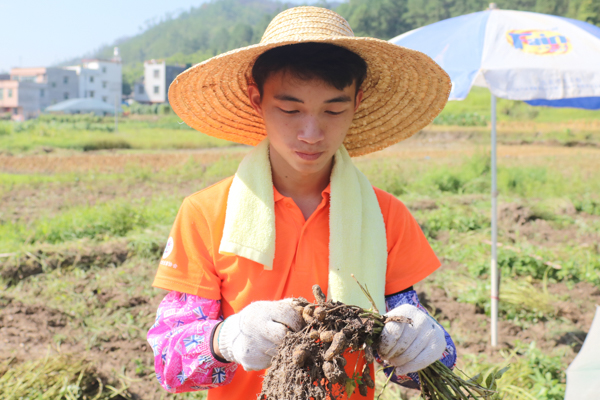 在“三下乡”期间,科技支农队顶着烈日在农地帮村民拔花生、收割农作物等,虽然衣服完全被汗水浸湿,但他们却忙的不亦乐乎。志愿者们身着橙色的志愿服,用实际的行动助力村民,明亮的志愿者服在田间形成一道独特的风景。