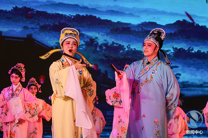 百年花朝,大戏开场,首届花朝戏艺术周暨紫金融入粤港澳大湾区人文交流活动在紫金县文化健身广场启幕,当晚吸引了近千名来自各地的观众以及嘉宾前来听曲赏戏。我校花朝戏演出代表队出演《梁祝》选段——花朝歌舞《你我鸿雁两分开》,内容为梁山伯与祝英台十八相送到长亭,依依惜别之际,祝英台为梁山伯做媒介绍自家小九妹的故事。我校艺术与设计学院老师林颖饰演梁山伯、邓钦芳饰演祝英台,花朝戏非遗传承班的学生伴舞。代表队一登台亮相,便抓住了观众们的目光。