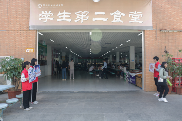 在光盘行动中,志愿者身穿红色的志愿服在食堂门口进行分点站岗,手持光盘行动宣传展板,向广大师生宣传“光盘活动”的主题及意义,倡导就餐师生文明用餐。