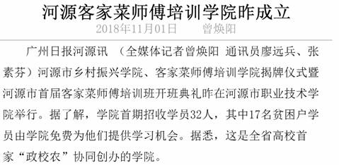 3.2018年11月1日,广州日报报道《河源客家菜师傅培训学院昨成立》,报道链接网址: