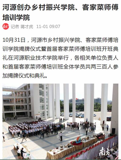 1.2018年11月1日,南方报业集团南方+报道《河源创办乡村振兴学院、客家菜师傅培训学院》,报道链接网址: