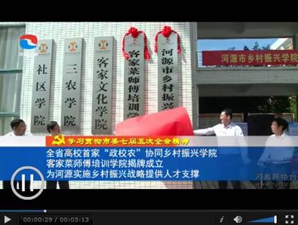 5.2018年11月1日,河源电视台新闻联播头条报道《全省高校首家“政校农”协同乡村振兴学院、客家菜师傅培训学院揭牌成立》,报道链接网址: