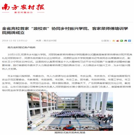 2.2018年11月2日,南方农村报报道《全省高校首家“政校农”协同乡村振兴学院、客家菜师傅培训学院揭牌成立》,报道链接网址: