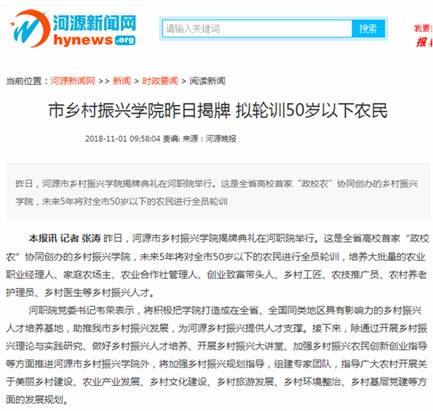 6.2018年11月1日,河源晚报报道《市乡村振兴学院昨日揭牌拟轮训50岁以下农民》,报道链接网址: