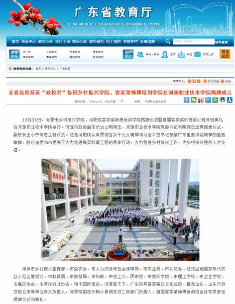 4.2018年11月1日,广东省教育厅报道《全省高校首家“政校农”协同乡村振兴学院、客家菜师傅培训学院在易游app入口站官网揭牌成立》,报道链接网址: