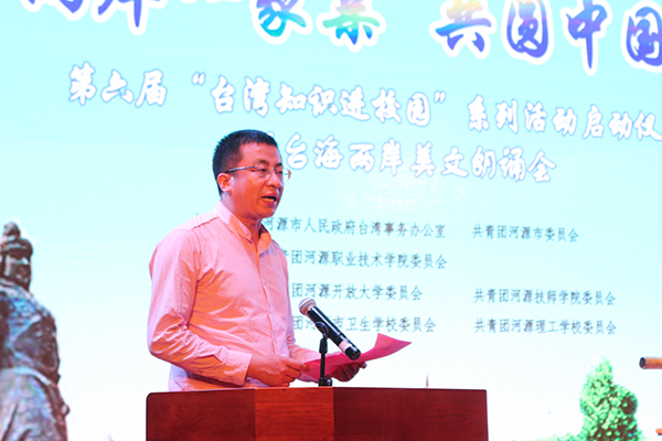 为深入学习贯彻党的十九大精神,扩大两岸经济文化交流,弘扬中华传统文化。11月15日晚,以“两岸一家亲,共圆中国梦”为主题的第六届台湾知识进校园系列活动启动仪式暨两岸美文朗诵会于我校艺术楼演播厅隆重举行。河源市人民政府台湾事务办公室主任李斌,团市委副书记、校团委书记陈晓峰,校团委副书记黄志鹏,河源理工学校团委书记钟燕龙、河源技师学院团委书记骆晓红、河源市卫生学校团委书记李茂良、河源开放大学团委书记曾秀华,河源市人民政府台湾事务办公室有关领导、我校各二级学院团总支书记及各学校师生代表均出席了此次活动。