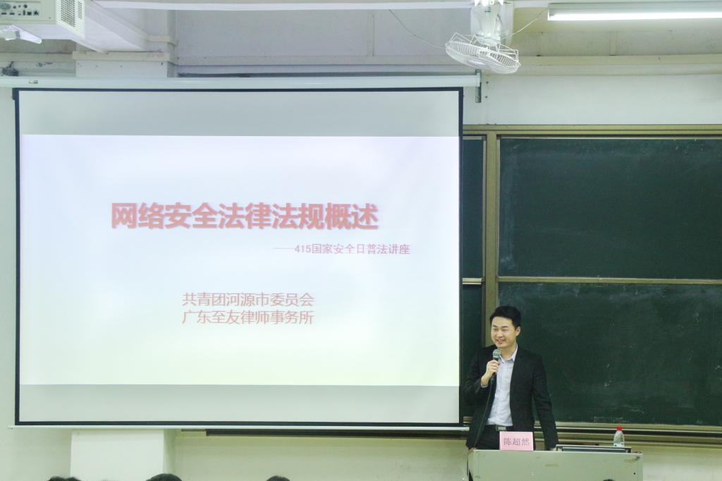 4月16日晚19:30,在第四个“4.15”全民国家安全教育日到来之际,由易游app入口站官网和源城区法律援助处联合举办的“4.15”全民国家安全教育日普法讲座在教学楼D107教室举行。广东至友律师事务所陈超然律师应邀担任此次普法讲座的主讲人,人文学院办公室主任刘少燕老师、团市委有关人员、易游app入口站官网法律诊所、法律协会师生以及众多来自不同专业的学生参加了此次讲座,现场气氛热烈。