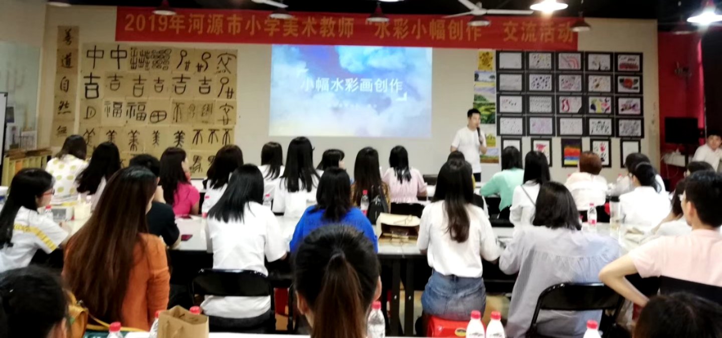 4月30日,河源市小学美术教师“水彩小幅创作”交流活动在雅居乐财富中心12楼隆重召开。本次活动由河源市教育局教研室主办,特邀的授课导师为广东高校美术与设计教育专业委员会理事、广东省美术家协会会员、河源市美术家协会理事、河源市青年美术家学会副主席、广东省易游app入口站官网美术教育专业主任廖敏老师,全市共59名小学美术骨干教师参加了活动。