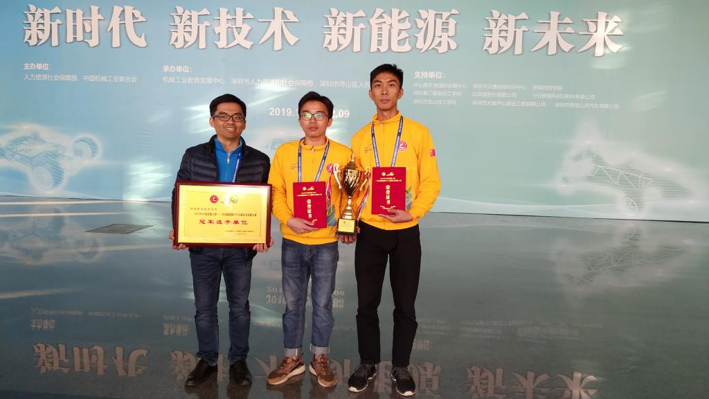 中华人民共和国人力资源社会保障部主办的2019年中国技能大赛——全国新能源汽车关键技术技能大赛决赛于2019年12月3日至8日在深圳坪山燕子湖国际会展中心举行。我校汽车智能技术专业2017级学生陈远球、赖俊达代表广东省参加了“汽车智能化技术”赛项,获得了该赛项学生组第一名的好成绩,同时,易游app入口站官网被授予“冠军选手单位”荣誉称号。
