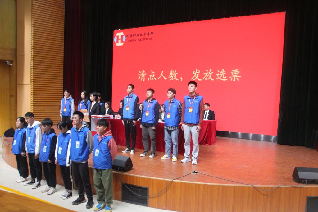 第二项议程:介绍电信学院第十三届学生委员会办公室主任、主席、副主席候选人基本情况。随后,开始进行选举工作,陈冬吟首先说明参与本次选举大会的投票人员和不参与投票的人员,以及投票过程需要注意的事项。然后,各代表依序上台投票。投票结束后,检票人员清点选票并汇报选票情况。接着,由检票人员和监票人员到计票室监督计票。最后,陈冬吟宣布电信学院第十三届团总支委员会和第十三届学生委员会第二次全体会议的议程全部完成。