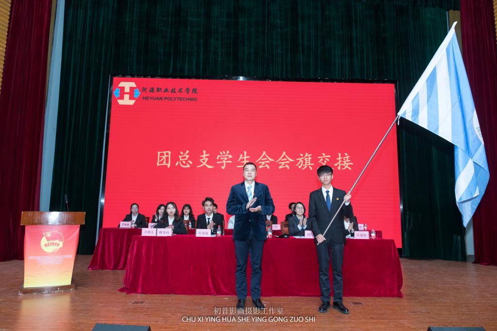 团总支书记杨日奎将电信学院团总支学生会会旗交于第十三届学生会主席黄宇燊。