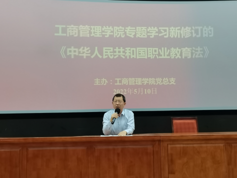 5月10日,工商管理学院在学术交流中心一楼3D导游实训室召开全院教职工大会,专题学习新修订的《中华人民共和国职业教育法》,学院党总支书记俞彤主持学习。
