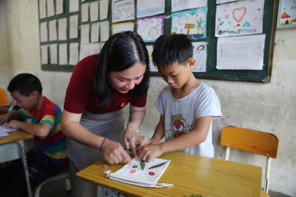 上午,党支部来到“三下乡”活动目的地瑶坑小学为小学生们献上了两堂精彩的实践课——由胡叶娟老师讲授的植物拓染实践课和由黄秀丽老师讲授的非遗扎染实践课。两位老师为小学生们精心准备了实践课必需的材料、工具等,然后在其他老师及“三下乡”学生志愿者的协助下,通过讲授、实操示范、现场指导及作品展示等环节,顺利完成了实践课教学。在课堂上,小朋友们对实践课非常感兴趣,也非常好奇,他们认真听课、积极实操、大胆提问,最后都完成了自己的作品。通过讲授实践课,开拓了小学生的知识视野,提高了小学生的手工制作能力,同时,培养了小学生热爱生活、热爱大自然的意识,帮助小学生树立起传承中国传统文化的观念。