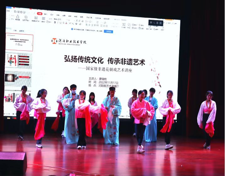 紫金花朝戏是国家级非物质文化遗产项目,廖瑞枚老师从历史渊源、传承与发展、艺术表演特征三个方面向同学们介绍了紫金花朝戏。讲座其间,廖老师带领台下的师生们进行花朝戏现场体验学习互动,如戏曲中舞台虚拟的程式化动作“开门”“关门”“上山”“下水”等。最后,由传承班学员向观众展示了花朝戏传统剧目《双花缘》的选段及花朝戏水袖基本功,是一场视觉与听觉的盛宴。我校“紫金花朝戏”获批第四批省级高校中华优秀传统文化传承基地建设单位。