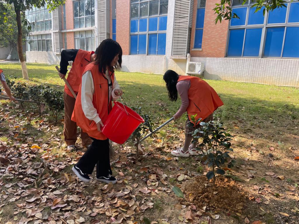 在植树复绿现场,大家分工协作:有的帮忙疏松泥土、有的给树浇水、还有的清扫实训楼外围树叶,互相配合,气氛融洽。