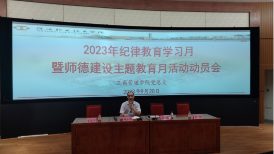 按照学校2023年纪律教育学习月活动工作部署,9月20日,工商管理学院党总支在实训三期3D导游模拟实训室召开2023年纪律教育学习月暨师德建设主题教育月活动动员会。赖小景副校长,学院全体教职工参加会议。