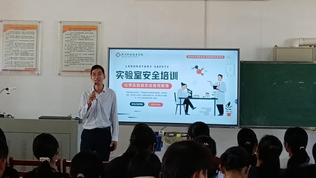 邱元凯老师从化学试剂安全规范使用、化验室废物的回收利用和处置、实验室应急处置等方面为学生开展了实验室安全培训,并演示了化学品灼伤的处理方法、洗眼器的使用等应急措施。