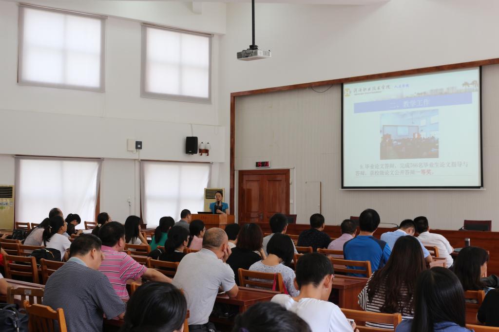 会议由学院负责人罗春娜从党建工作、教学科研、学生管理、工会工作、校企合作、共青团工作等七个方面总结了过去一个学期学院工作亮点,特别是在社会服务进账方面,政校合作经费突破80万元,首次实现师范生实习费用正向进账。同时也总结了学院本学期的不足之处,并对下学期的工作提出了七点思路和要求。