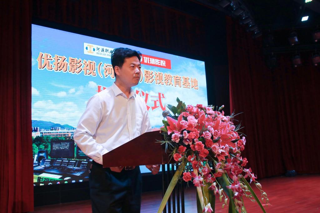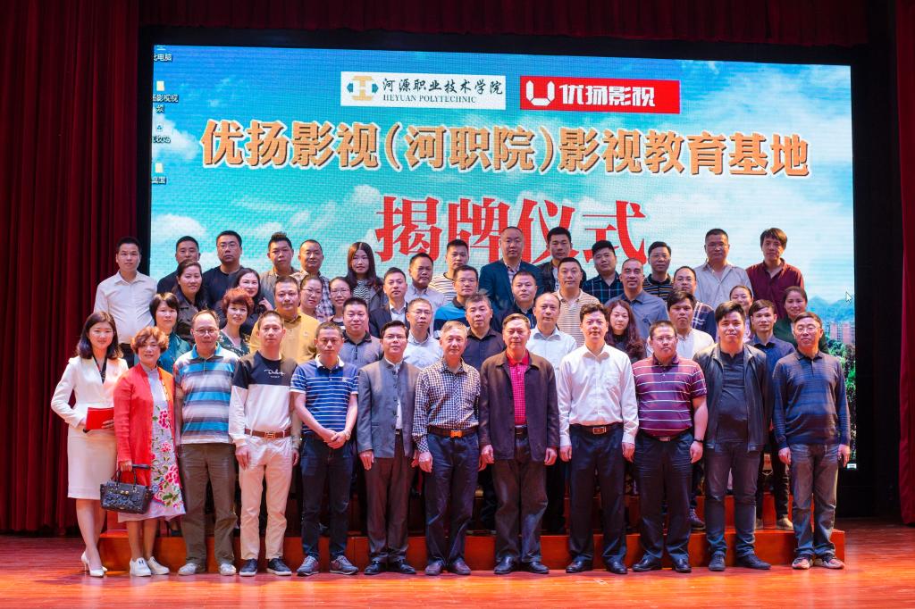 3月28日上午,“优扬影视(河职院)影视教育基地”揭牌成立仪式在艺术演播厅隆重举行。河源市优扬影视传媒有限公司(下简称:优扬影视)叶泉董事长、洪燕总经理以及公司相关人员,河源市文联副主席邹国忠先生、原河源市体育局局长古水桂先生、原河源市电视台副台长车济民先生、相关企业领导,以及我校电信学院、继续教育学院师生代表出席了仪式。