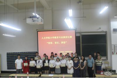 6月5日晚,人文学院于教学楼D206顺利举行主题为“责任、青春、梦想”的小学教育专业演讲比赛。郑尔君、朱玉梅、袁炫芳、曾志梅、黄志基、吴碧红老师担任了此次比赛的评委,小学教育专业的全体师生参与了此次比赛。